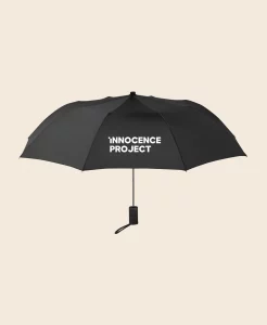 Innocence Project Logo Umbrella – Black umbrella with Innocence Project logo on one panel. The umbrella has a button that you can press to open it.